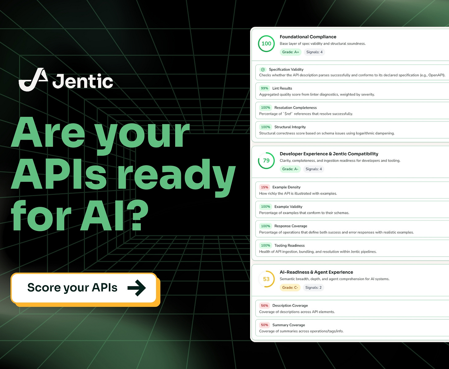 Jentic’s AI‑readiness scorecard gives teams a fast, standards‑aligned view of how usable an API is for agents. It surfaces gaps in summaries, examples, error handling, and auth that block reliable automation, and prioritises the improvements that raise both developer experience and agent success. Use it to benchmark APIs, align teams on readiness, and keep control as AI systems become the dominant API consumers.