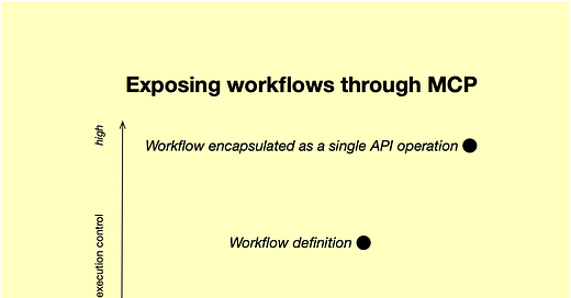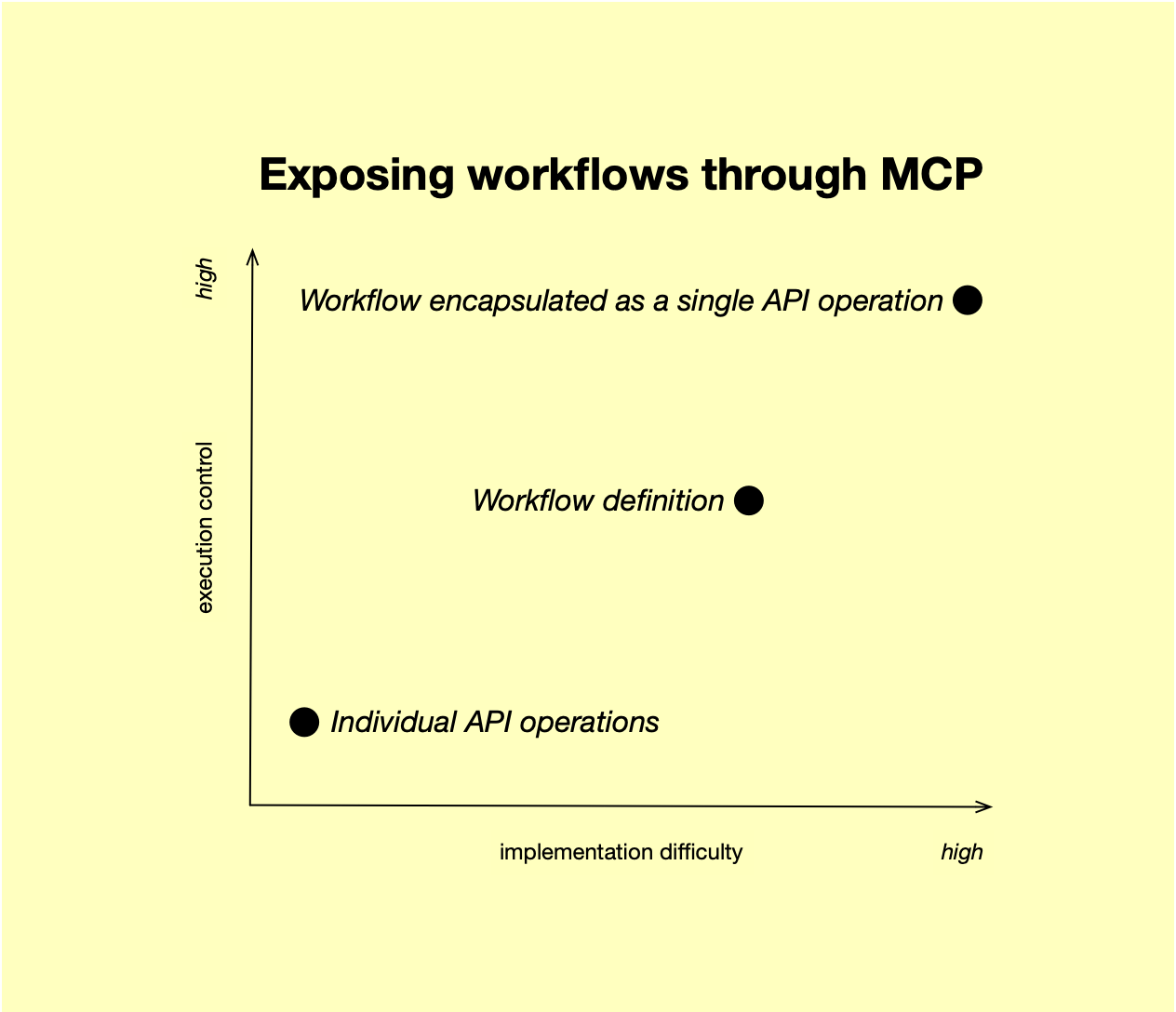 Creating a specific workflow and exposing it through an MCP is a great option if what you want is full control over what AI agents can execute. The choice of offering a workflow leaves no room for interpretation. AI agents will simply parse the workflow definition and execute whatever operations are there, one by one. Another advantage is that there won't be any ambiguity about input parameters for each operation and how operations are chained together. Everything is configured in the workflow definition. However, the higher the number of operations a workflow has, the higher the chances of failure are. And, how do you handle the failure of a multi-step workflow? Should the AI agent retry the operation that triggered the failure? Or, should it give up and share an error message to the end user? These are questions that don't have easy answers, I know. "It depends" can't certainly be the right answer. At least, not for me. That is why some people prefer a third option, which is to encapsulate the chaining of multiple workflow steps into a single exposed API operation.
